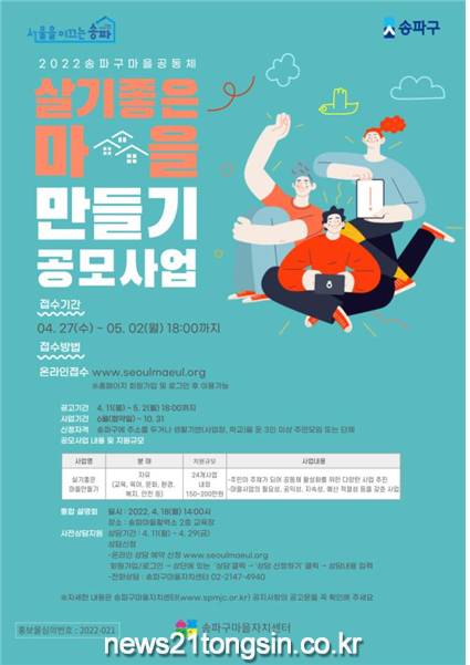 ▲ 사진=송파구송파구는 주민 스스로 살고 싶은 마을을 만드는 ‘2022년 살기좋은 마을만들기 공모사업’을 오는 5월 2일까지 접수를 받는다고 밝혔다.