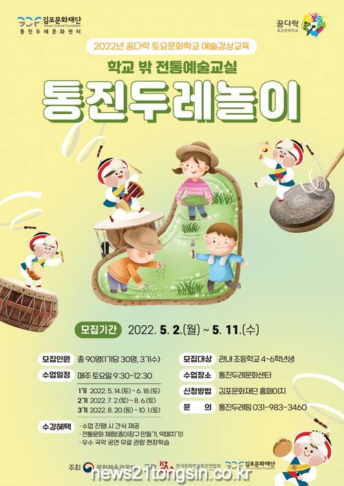 ▲ 사진=김포문화재단 제공김포문화재단 통진두레문화센터는 초등생을 대상으로 ‘2022 꿈다락 토요문화학교 예술감상교육-학교 밖 전통예술교실, 통진두레놀이’의 수강생을 모집한다고 밝혔다.