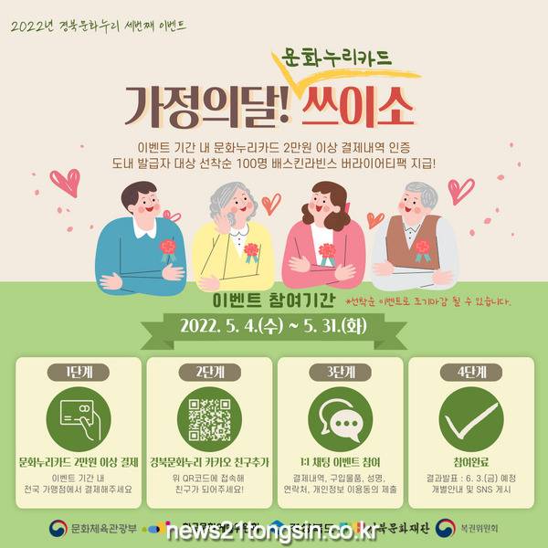 경상북도는 경북문화재단(대표 이희범)과 함께 문화누리카드 지역 이용자를 대상으로‘가정의 달! 문화누리카드 쓰이소’ 이벤트를 진행한다.