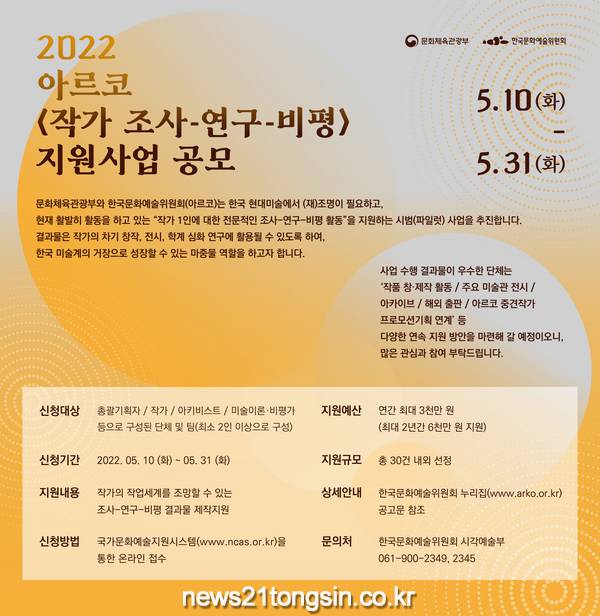 지원 사업은 이달 10일 부터 31일 까지 우리나라 우수 작가와 작품을 조명할 수 있는 기획자, 작가, 기록전문가, 미술 분야 이론·비평 연구가로 구성된 단체와 팀을 공모한다. ‘단체’는 고유번호증 혹은 사업자등록증을 가진 그룹이며 ‘팀’은 이번 사업을 위해 임의 조직된 그룹으로 신청자는 개인 명의여야 한다.