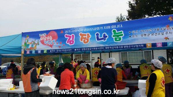 양평군종합자원봉사센터(센터장 이승구)와 대한적십자봉사회 양평군지구협의회(회장 이승남)에서는 11월 4일부터 5일까지 이틀 동안 추운 겨울 어려운 이웃들에게 따뜻한 온기를 전해주기 위해 “2015 사랑의 김장 나눔”행사를 가졌다.
