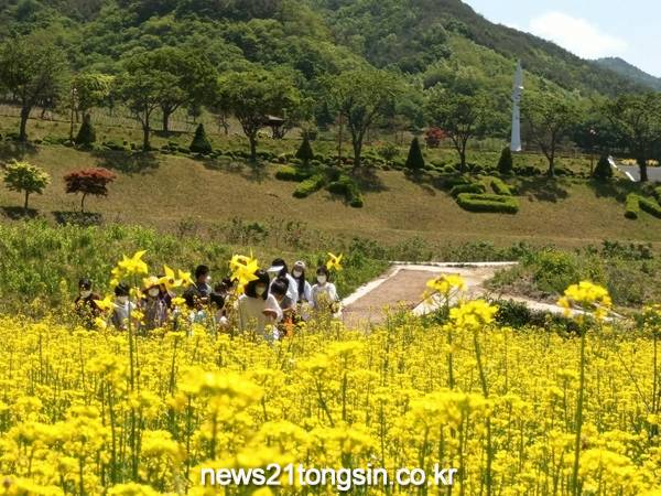 거창사건사업소(소장 김성목)의 추모공원 맞은편에 조성한 약 3,000평 규모의 경관단지에는 지금 유채꽃이 한창 만발했다.