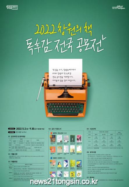 창원시는 ‘창원의 책’이라는 이름으로 ‘한 도시 한 책 읽기’ 운동의 첫걸음을 시작한다. 창원시도서관사업소는 2022 창원의 책 선정 도서와 후보 도서 20권을 지정해 독후감 전국 공모전을 5월 2일부터 9월 30일까지 독후감·독후화 분야에 대해 전 국민을 대상으로 실시한다.