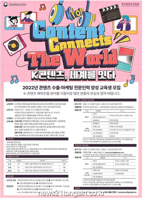 ▲ 사진=문화체육관광부문화체육관광부는 한국콘텐츠진흥원과 함께 한류 콘텐츠의 지속적인 해외진출을 지원하기 위해 6월 21일(화)부터 12월 초까지 ‘콘텐츠 수출‧마케팅 전문인력 양성 교육과정’을 운영한다고 밝혔다.