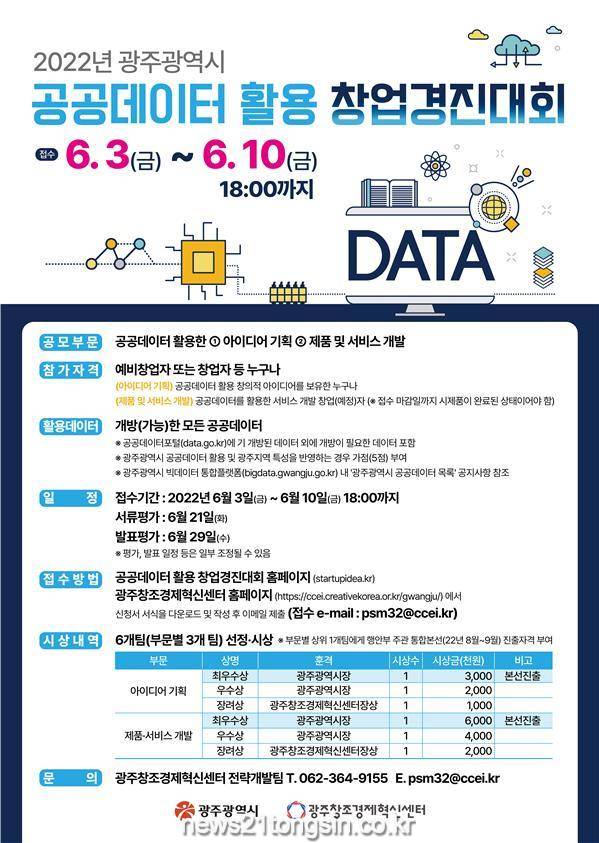 광주광역시는 공공데이터를 활용해 창의적 아이디어와 신규 비즈니스 모델을 발굴하고 창업을 활성화하기 위해 ‘2022년 광주광역시 공공데이터 활용 창업경진대회’를 개최한다.