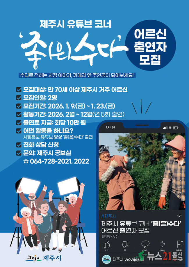 제주시는 올해 새롭게 노년층 대상 유튜브 코너 ‘좋(은)수다’를 신설하고, 프로그램에 출연할 어르신 배우 2명을 공개 모집한다고 12일 밝혔다.‘좋(은)수다’는 생활 밀착형 시책과 미담사례, 특색 있는 삶의 이야기를 동네 어르신과 함께 전달하는 유튜브 코너로, 연간 5편의 영상이 제작될 예정이다. 프로그램 출연자는 공보.