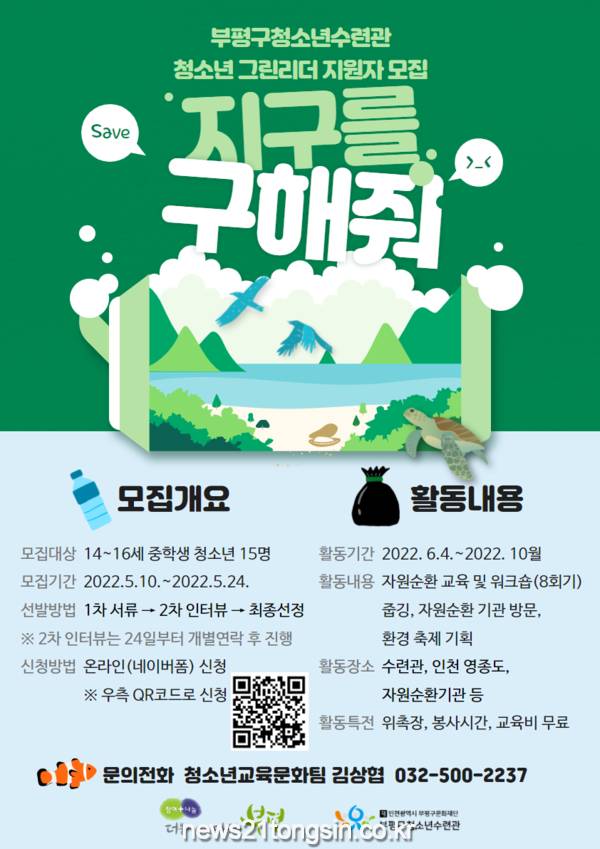 부평구 청소년수련관은 오는 24일까지 지역 내 환경지킴이로 성장하고 싶은 청소년을 대상으로 그린리더 양성 프로그램 참가자를 모집한다.