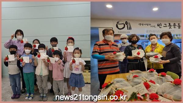 이천 효양도서관은 5월 가정의 달을 맞아 운영 중인 “효도 함께 가정”의 장미카네이션 액자 & 엽서만들기 수업 연계로 참여 어린이들이 직접 손 글씨로 꾸민 카네이션 엽서를 지난 7일 인근 경로식당 무료급식소를 찾아 어르신들께 전달했다.