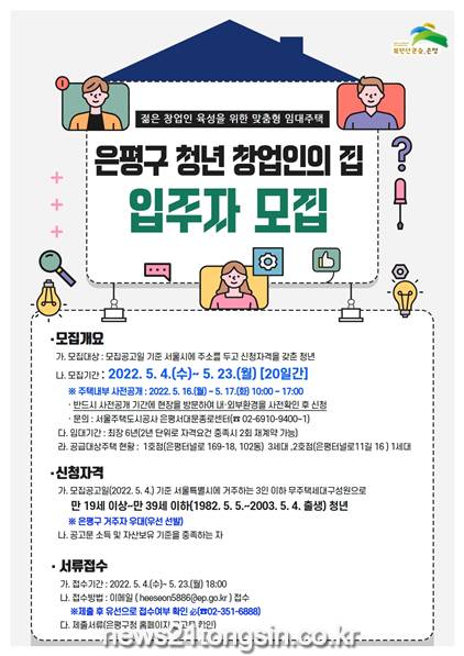 은평구는 청년 창업인 육성과 창업 성장기반 조성을 위한 맞춤형 공공임대주택인 ‘청년 창업인의 집’ 입주자를 오는 23일까지 모집한다.