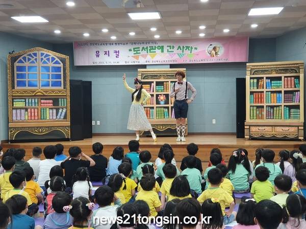 경상북도교육청 삼국유사군위도서관(관장 이상욱)은 5월 11일 군위도서관 시청각실에서 관내 유치원 및 초등학교 어린이를 대상으로 문화나누리 공모사업 뮤지컬 ‘도서관에 간 사자’를 공연했다.