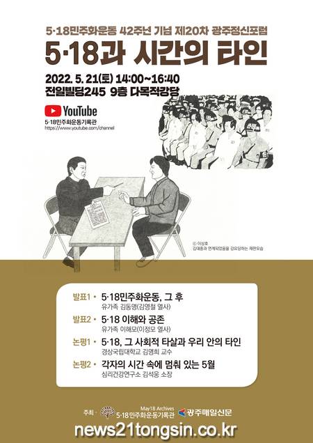 5·18민주화운동기록관(이하 ‘기록관’)은 21일 전일빌딩245 다목적강당에서 ‘5·18과 시간의 타인’이라는 주제로 5·18민주화운동 42주년을 기념하는 제20차 광주정신포럼을 개최한다.