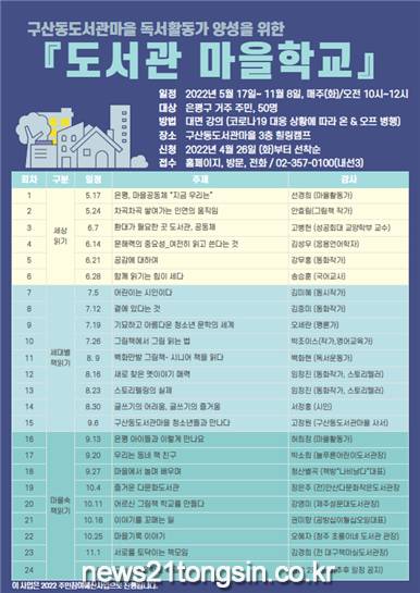은평구립구산동도서관마을은 2022년 주민참여예산사업으로 선정된 마을독서활동가 양성을 위한 ‘도서관 마을학교’ 프로그램을 오는 17일부터 11월 8일까지 운영한다.