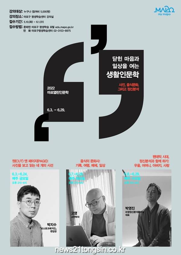 서울 마포구는 일상에서 쉽게 접할 수 있는 주제를 다루는 생활 인문학 강의인 ‘마포열린인문학’을 6월 한 달 동안 운영한다고 20일 밝혔다.