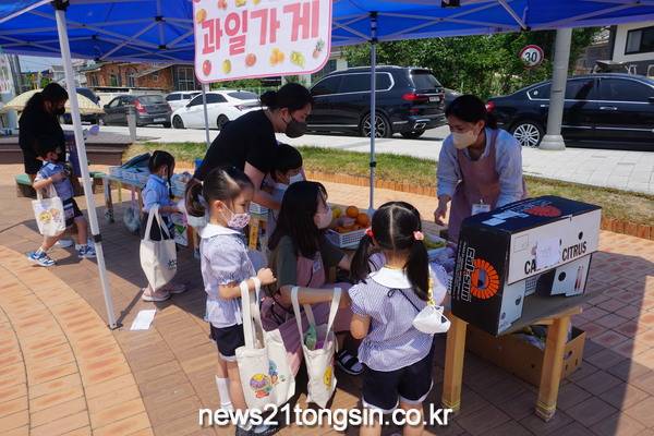 이날 시장놀이는 과일가게, 야채가게, 문방구, 하나벅스(음료), 분식가게(떡볶이,순대, 어묵, 팝콘, 솜사탕 등)와 아나바다 장터로 상점을 개설하였으며 아이들은 동전 100원으로 구매할 때 지켜야 할 예절과 규칙, 절제를 체험하였다.