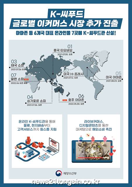 해양수산부는 K-씨푸드관을 통해 국내 수출기업의 해외시장 진출을 돕고 있다. 지난해 7월 중국 타오바오(Taobao)를 시작으로 미국 에이치프레시(H-Fresh), 태국과 싱가포르 쇼피(Shopee), 8월에는 미국 아마존(amazon)에 K-씨푸드관을 개설했다.