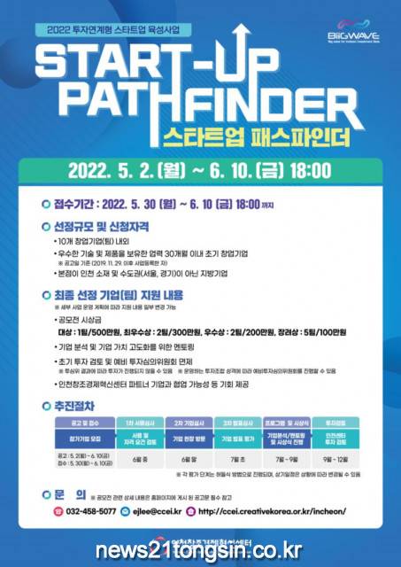 인천창조경제혁신센터는 유망 초기기업 발굴 및 육성을 위한 ‘2022 스타트업 패스파인더 공모전’ 접수를 30일부터 시작한다.
