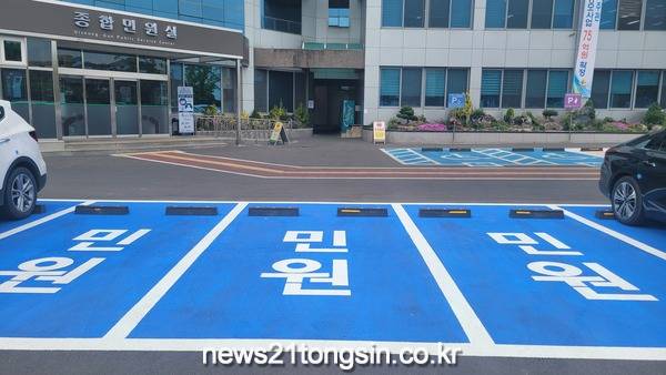 이를 보완하고자 주차면에 ‘민원’ 표시를 하여 민원으로 방문하시는 분들이 우선 사용할 수 있도록 하였고 이번 시행을 통해 민원만족도가 향상되리라 기대하고 있다.