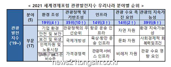 문화체육관광부는 2021년 세계경제포럼(World Economic Forum)의 관광발전지수 평가 결과 대한민국의 종합순위가 117개 평가대상 국가 중 15위를 기록했다고 밝혔다.