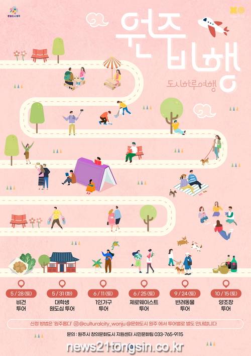 도시하루여행 ‘원주비행’은 라이프스타일 나누고, 새로운 네트워크를 확장하고 싶은 원주시민 60명을 대상으로 ▷비건투어, ▷대학생 원도심 투어, ▷1인가구 투어, ▷제로웨이스트 투어, ▷반려동물 투어, ▷양조장 투어로 총 6회 진행된다.