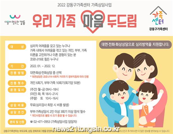 자세한 일정과 내용은 홈페이지(https://gangdong.familynet.or.kr) 및 카카오톡 ‘강동구가족센터’를 친구 추가하여 확인할 수 있으며, 강동구가족센터(☎02-471-0812)로 문의하면 안내받을 수 있다.