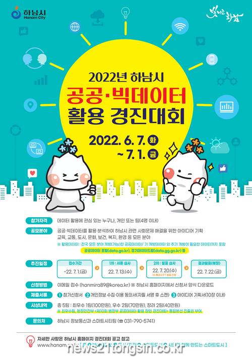 하남시는 공공·빅데이터를 분석해 각종 사회문제 해결에 도움이 되는 창의적인 아이디어를 발굴하고자 ‘2022년 하남시 공공·빅데이터 활용 경진대회’를 개최한다고 7일 밝혔다.
