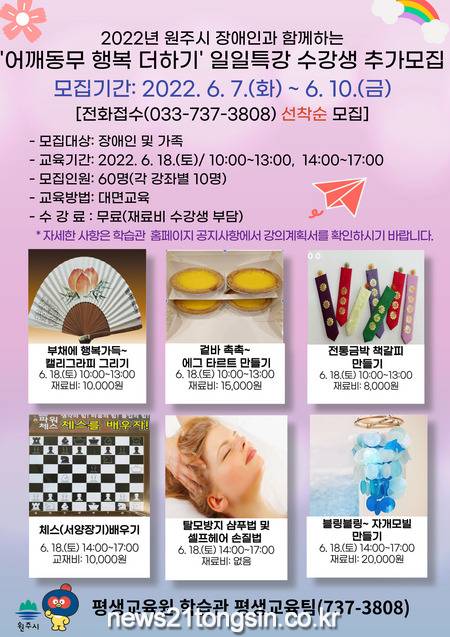 원주시 평생교육원 학습관에서는 원주시 장애인과 함께하는 ‘어깨동무 행복 더하기’ 일일특강 수강생을 6월 7일부터 6월 10일까지 추가 모집한다고 밝혔다.