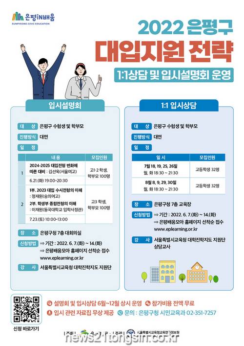 김미경 은평구청장은 “수험생·학부모에게 양질의 공교육 기반 입시 프로그램을 통해 급변하는 입시정보를 적기에 제공하길 바란다”면서 “학생들의 진로진학 탐색 역량을 길러주는 유익한 시간이 되길 기대한다”고 전했다.
