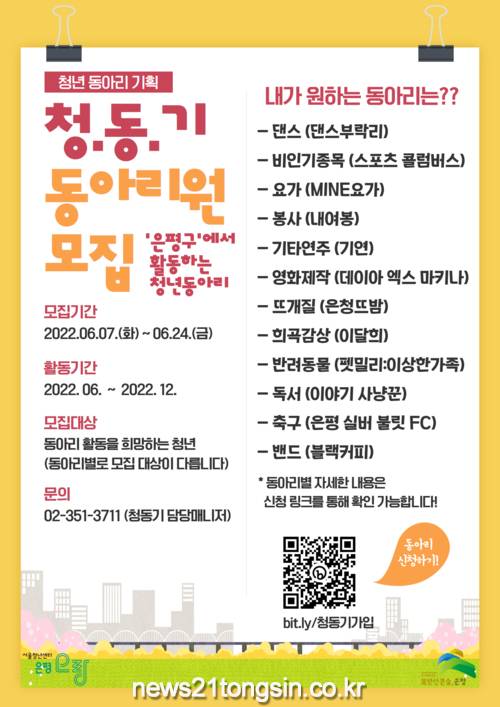 은평구는 ‘청년 동아리 기획 지원사업’ 참여 동아리에서 활동할 청년 동아리원을 모집한다고 밝혔다.