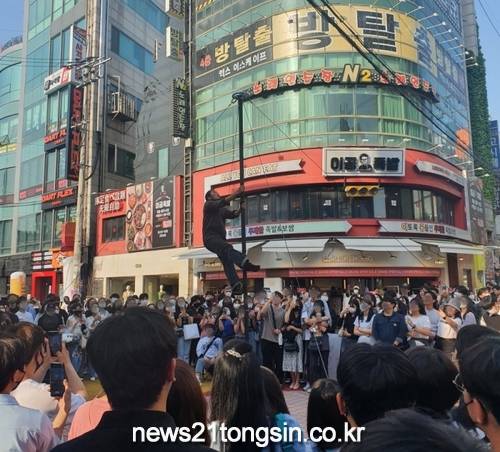 이는 마포구가 지난 4월 서울거리아티스트협동조합과 업무협약을 체결하고, 6월부터 거리 공연 아티스트가 홍대축제거리(서교동 365-28 일대)에서 공연을 선보이고 있는 모습이다.