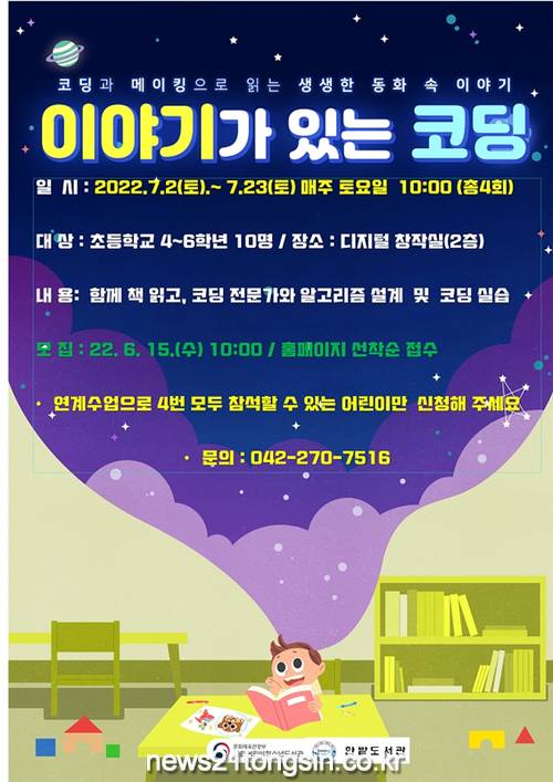 한밭도서관은 내달 2일부터 23일까지 매주 토요일(총4회)에 걸쳐 초등4~6학년을 대상으로‘이야기가 있는 코딩’프로그램을 운영한다.