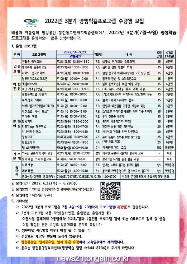 이천시 창전동주민자치학습센터는 다음달 7월부터 9월까지 진행하는 평생학습프로그램에 참가할 수강생을 온라인 접수를 통해 모집한다고 14일 밝혔다.