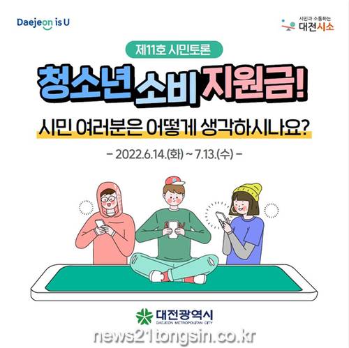 대전시는 정책제안 플랫폼 ‘대전시소(daejeon.go.kr/seesaw)’에서 ‘청소년 소비 지원금, 시민여러분의 생각은 어떠신가요?’라는 주제로 6월 14일부터 한달 간 시민들의 다양한 의견을 수렴한다.