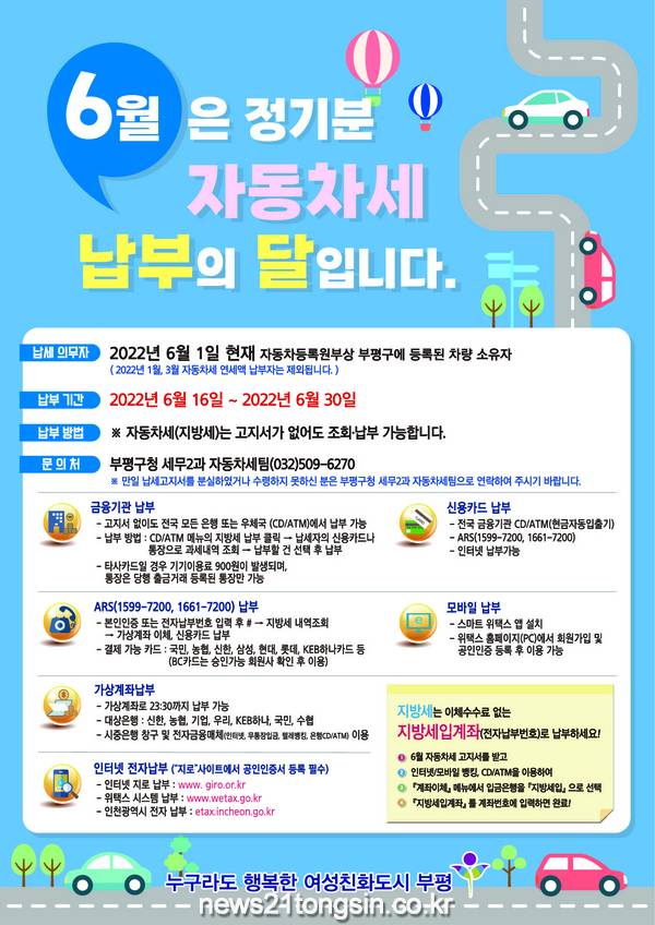 인터넷 전자납부는 검색창에 지로, 위택스, 인천광역시 전자고지납부시스템을 입력해 접속하면 신용카드 및 계좌이체로 납부할 수 있다. 기타 자세한 사항은 부평구청 세무2과 자동차세팀(☎509-6270)으로 문의하면 된다.