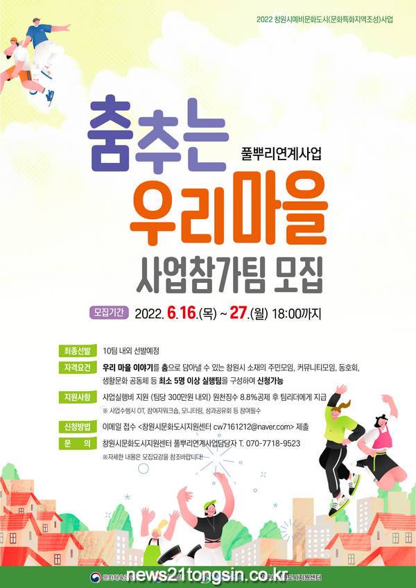 창원특례시와 창원시문화도시지원센터는 풀뿌리 연계사업 ‘춤추는 우리 마을’ 사업에 참가할 팀을 오는 27일까지 모집한다고 밝혔다.