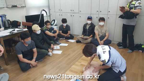 훈련은 생략하고 도선사협회 사무실(장생포 세관 통선장)에서 심폐소생술(CPR), 자동제세동기(AED)사용법 등 응급처치 실습 위주의 실내 교육으로 실시되었다.