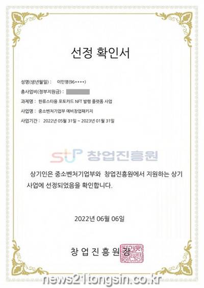 메타홀딩즈는 중소벤처기업부 2022년도 예비창업패키지 지원 기업 사업에서 한류스타용 포토카드 NFT 발행 플랫폼 ‘스타랑’이 과제로 선정됐다고 17일 밝혔다.