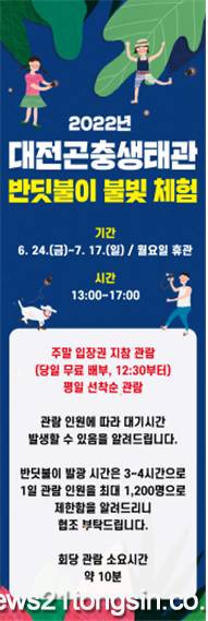 대전시는 시민들에게 이색 볼거리 제공을 위하여 6월 24일부터 7월 17일까지 대전곤충생태관에서 반딧불이 특별기획전을 개최한다고 밝혔다.