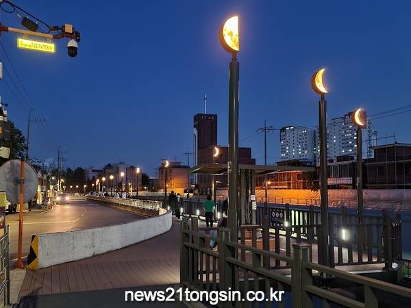 경관조명은 초승달부터 그믐달까지 다양한 모양이다. 달이 차오르고 기우는 모습을 표현해 보행자가 보는 즐거움을 느낄 수 있도록 했다. 데크길 끝에는 초승달 모양의 조명 의자 2개를 추가로 설치해 주민들이 잠시 쉬어 갈 수 있는 쉼터로 조성했다.