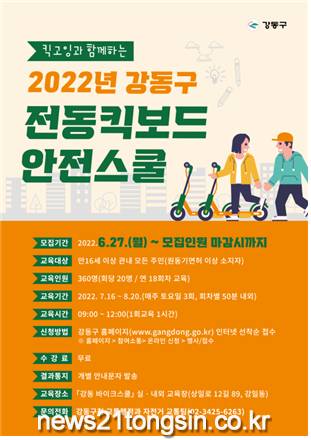 전동킥보드 안전스쿨은 오는 7월 16일부터 8월 20일까지 6주간 매주 토요일, 강동바이크스쿨 내 실‧내외 교육장에서 일일 3회차씩 진행되며, 회차별로 최대 20명까지 참여할 수 있다.
