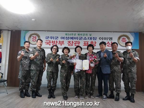 이미영 대장은 군위군 여성예비군 소대장으로 활동하면서 6.25참전용사, 장애우, 독거노인 등 불우이웃들에게 200만원 상당의 쌀을 전달하였으며, 지역 봉사단체와 협력하여 벽화그리기, 환경정비, 코로나19 방역활동 등 봉사활동에 적극 동참하고 여성예비군 소대장으로서 역할을 성실히 수행하여 타 단체에 모범과 귀감이 되어 장관 표창 수상의 영광을 안았다.