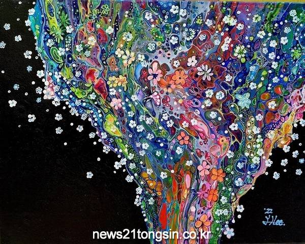 작가는 푸어링 아트로 그린 작품과 그 위에 자신만의 느낌으로 이미지를 재해석해서 표현하는 작품도 있다. 이 기법은 예측할 수 없는 우연적 형태에서 예술적 가치를 포착하는 즐거움 있으며, 환상적이고 신비로운 느낌을 자아내기도 한다.