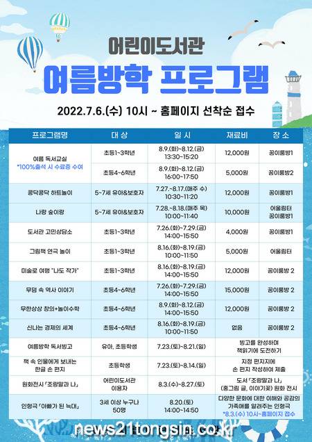 도서관 관계자는 “여름방학 동안 어린이들이 독서에 흥미를 붙이고 생각의 폭이 넓어지길 바라는 마음으로 여름방학 프로그램을 준비했다. 어린이도서관과 함께 즐겁고 알찬 여름방학을 보내길 바란다.”라고 전했다.