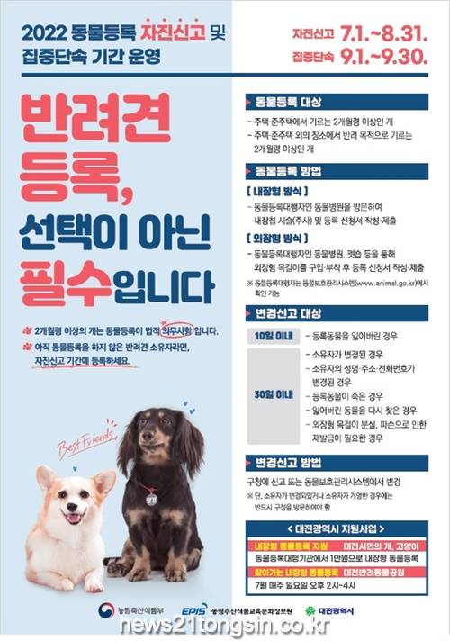 대전시는 오는 8월말까지 ‘반려동물등록 자진신고 기간’을 운영한다고 27일 밝혔다.