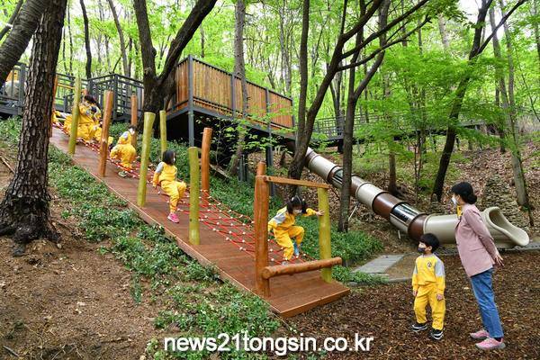 특히, 1구간은 유아숲체험장(2,500㎡ 규모)과 이어지도록 설계했다. 산책로 입구 경사를 활용해 아이들이 밧줄오르기, 데크슬라이드, 타잔놀이대, 네트 오르기 등을 즐길 수 있도록 했다.