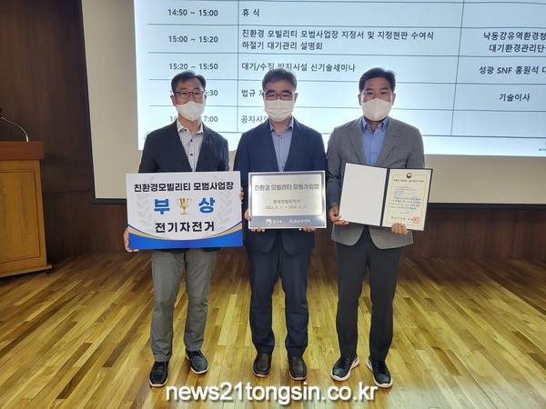 낙동강유역환경청(청장 박재현)과 울산광역시(시장 송철호), 사)울산환경기술인협회(회장 유동기)는 공모를 통해 SK Picglobal(주), 현대자동차(주) 울산공장, 롯데정밀화학(주) 등 3개 사업장을 「친환경 모빌리티 모범사업장」으로 선정하고 6월 29일에 지정서와 지정현판을 수여했다.