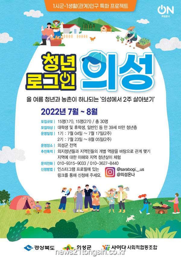 의성군은 ‘1시군-1생활(관계)인구 특화 프로젝트: 의성ON나’의 첫번째 프로그램인 ‘청년 로그인 의성’ 2기 참여자를 오는 7월 4일까지 모집한다.