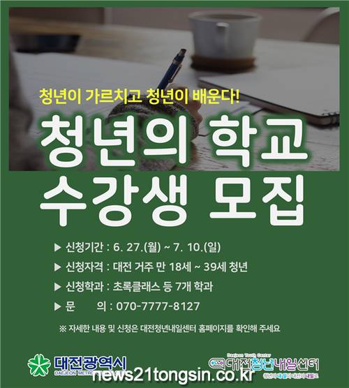 자세한 학과 내용과 일정, 신청방법 등은 대전청년내일센터 홈페이지(www.daejeonyouth.co.kr)에서 확인 가능하며, 기타 궁금한 사항은 대전청년내일센터(☎070-7777-8127)로 문의하면 된다.