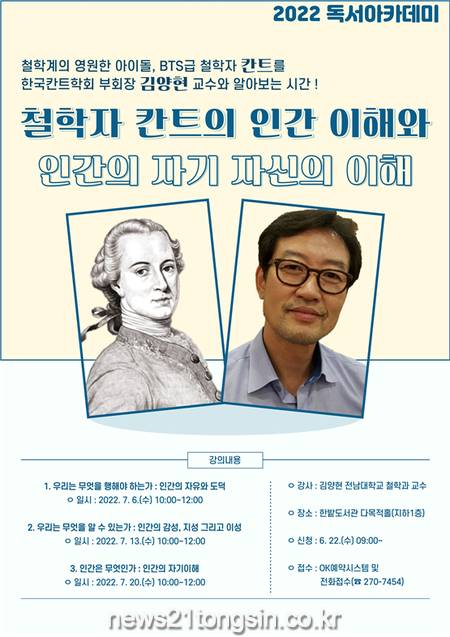 이번 2차 강연은 7월 6일, 13일, 20일 수요일 오전10시부터 2시간씩 3회 일정으로 한밭도서관 다목적홀에서 열리며, 김양현 전남대학교 철학과 교수를 초청하여 ‘철학자 칸트의 인간 이해와 인간의 자기 자신의 이해’를 주제로 진행할 계획이다.