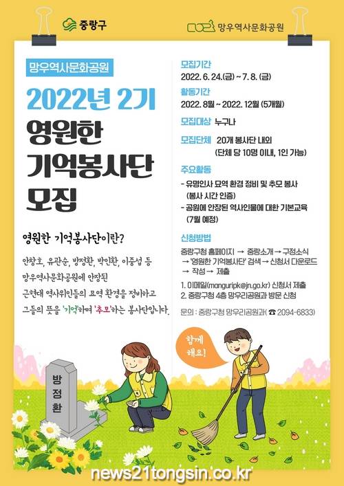 ▲ 사진=중랑구 / `중랑구 영원한 기억봉사단` 포스터중랑구가 이달 8일까지 망우역사문화공원에 안장된 근현대 역사인물들의 뜻을 기억하고 추모하는 ‘2022년 2기 영원한 기억봉사단’을 모집한다.