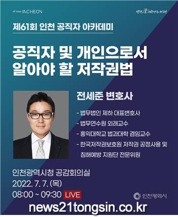 인천광역시는 7일 오전8시 인천시 공직자 및 시민들을 대상으로 「공직자 및 개인으로서 알아야 할 저작권법」을 주제로 ‘제61회 인천 공직자 아카데미’를 개최한다.